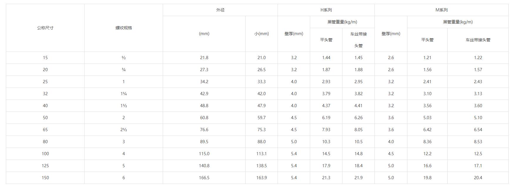 | (mm) | 小(mm) | 壁厚(mm) | 黑管重量(kg/m) | 壁厚(mm) | 黑管重量(kg/m) | ||||