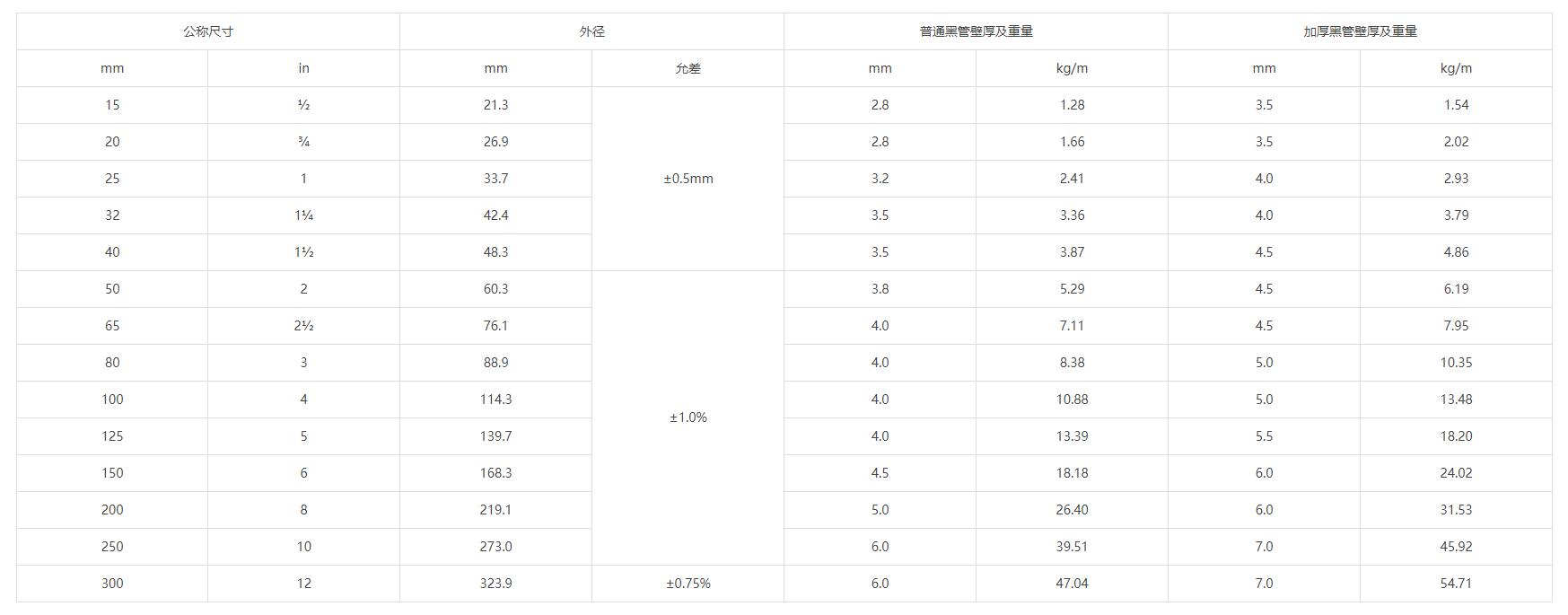| 公称尺寸 | 外径 | 普通黑管壁厚及重量 | 加厚黑管壁厚及重量 | ||||