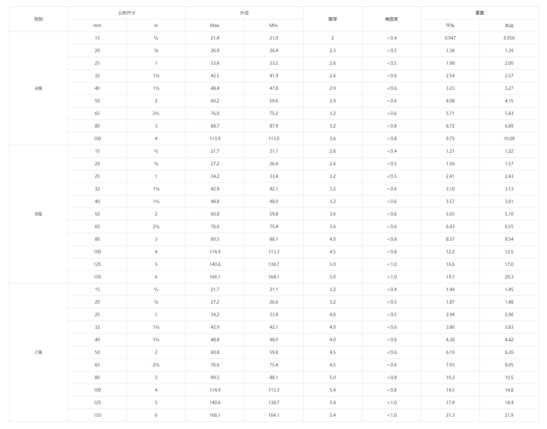 | 级别 | 公称尺寸 | 外径 | 壁厚 | 椭圆度 | 重量 | |||