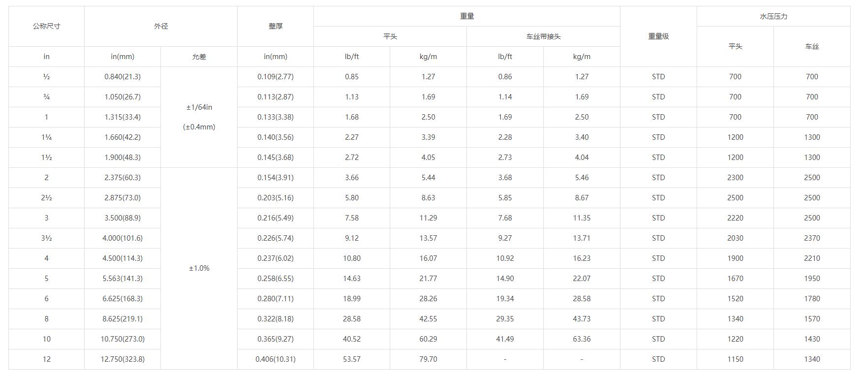 | in | in(mm) | 允差 | in(mm) | lb/ft | kg/m | lb/ft | kg/m | |||