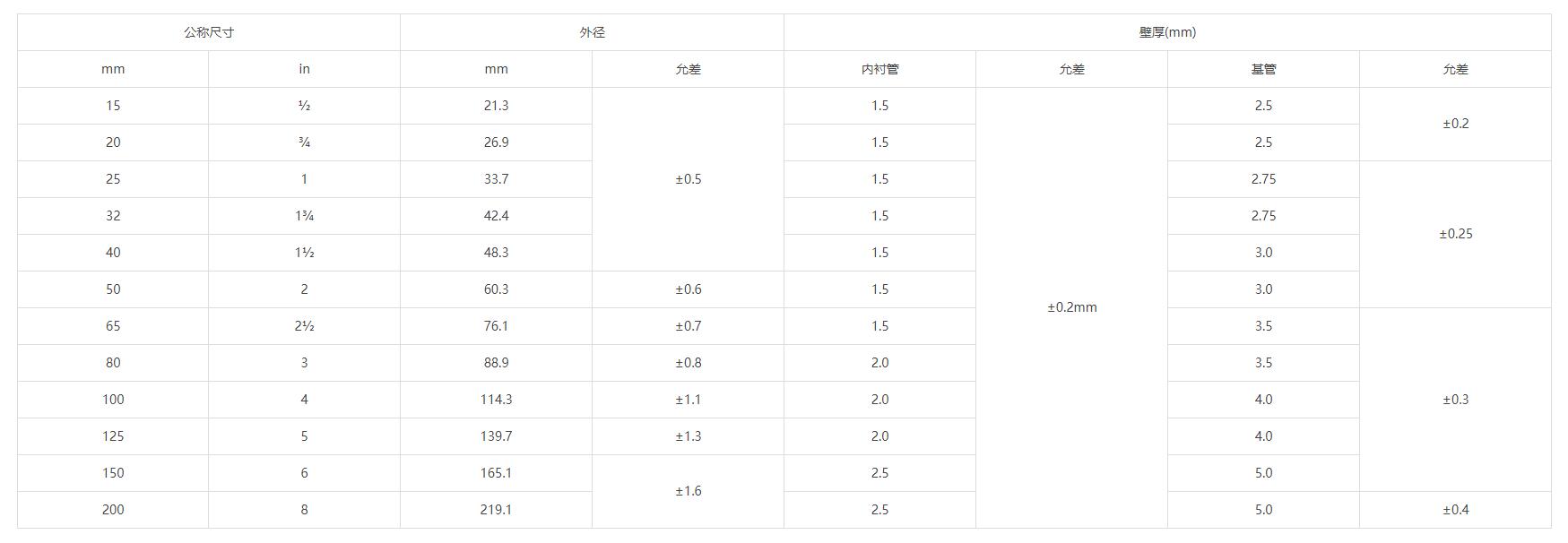 | mm | in | mm | 允差 | 内衬管 | 允差 | 基管 | 允差 |