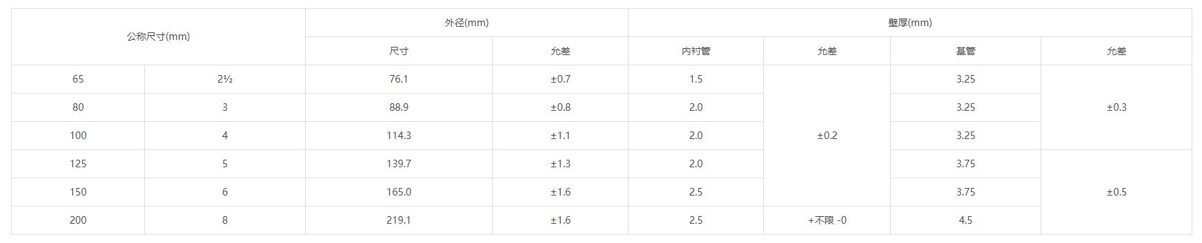 | 尺寸 | 允差 | 内衬管 | 允差 | 基管 | 允差 | ||