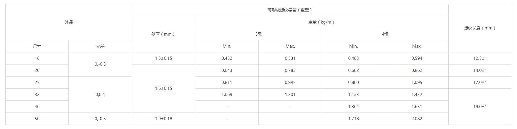 | 外径 | 可形成螺纹导管(重型) | 螺纹长度(mm) | |||||