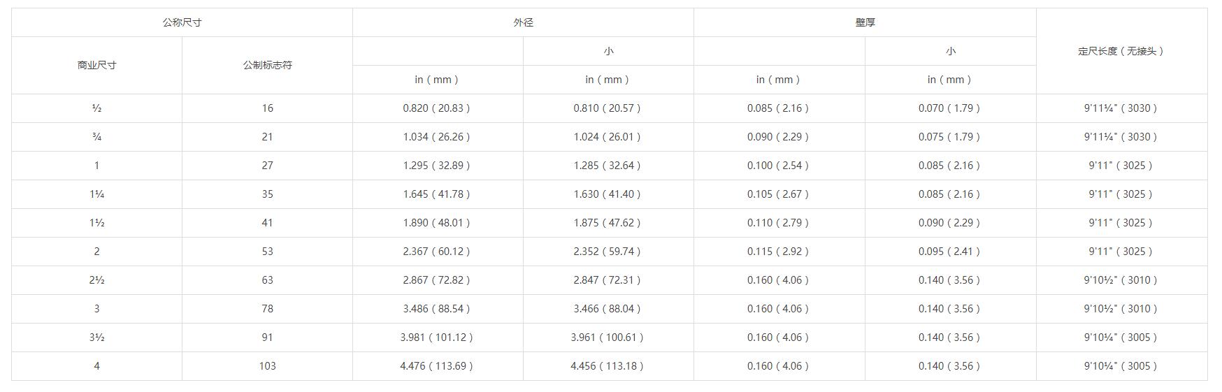 | 公称尺寸 | 外径 | 壁厚 | 定尺长度(无接头) | |||