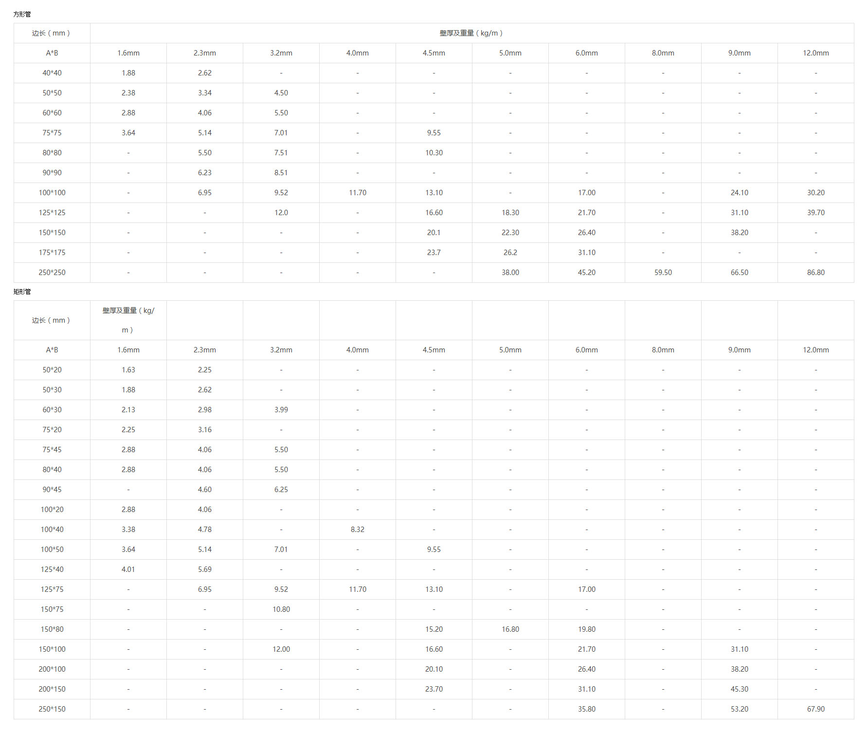 | 边长(mm) | 壁厚及重量(kg/m) | |||||||||