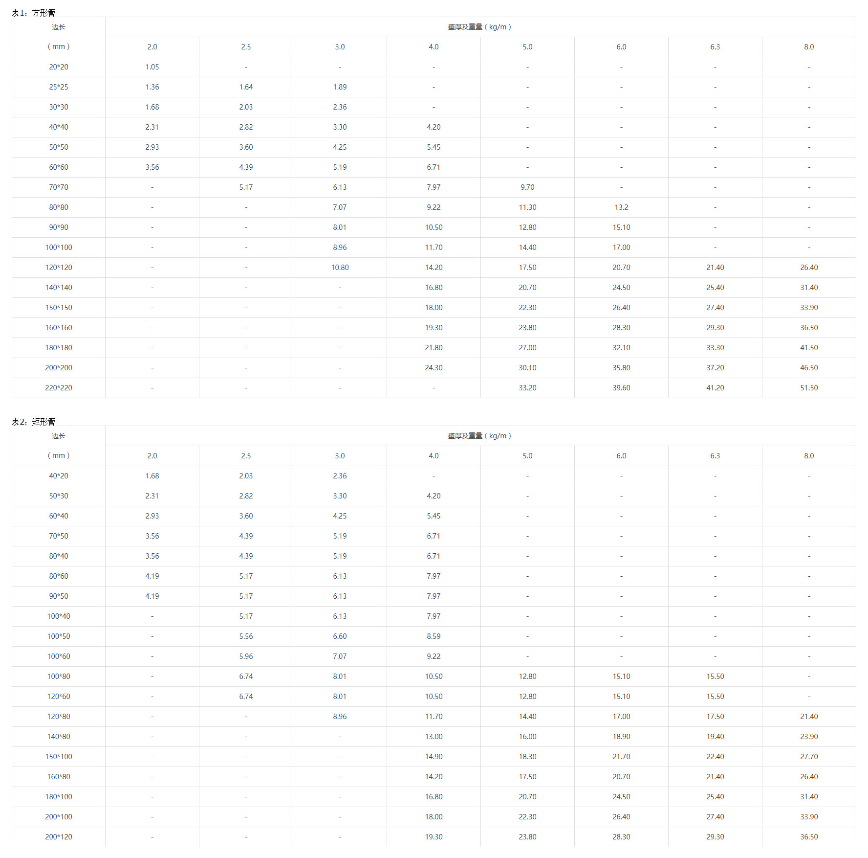 边长 (mm) | 壁厚及重量(kg/m) | |||||||