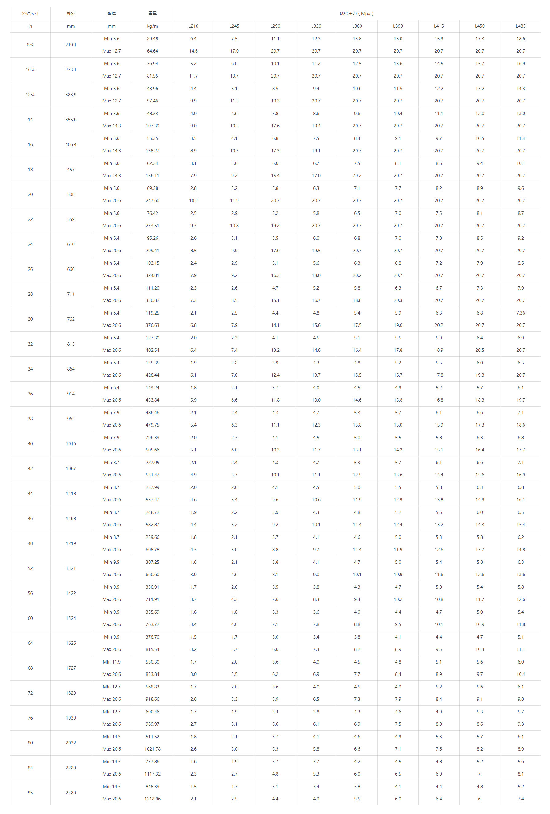 | 公称尺寸 | 外径 | 壁厚 | 重量 | 试验压力(Mpa) | ||||||||